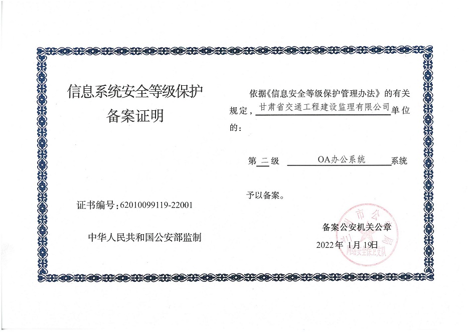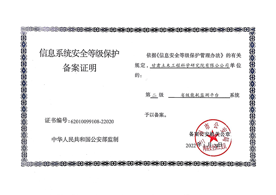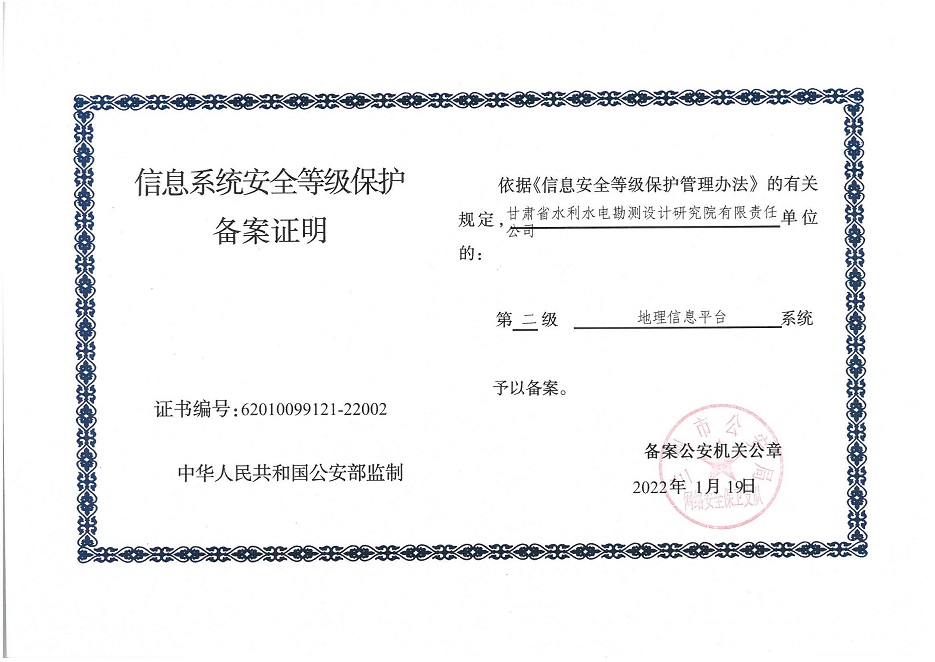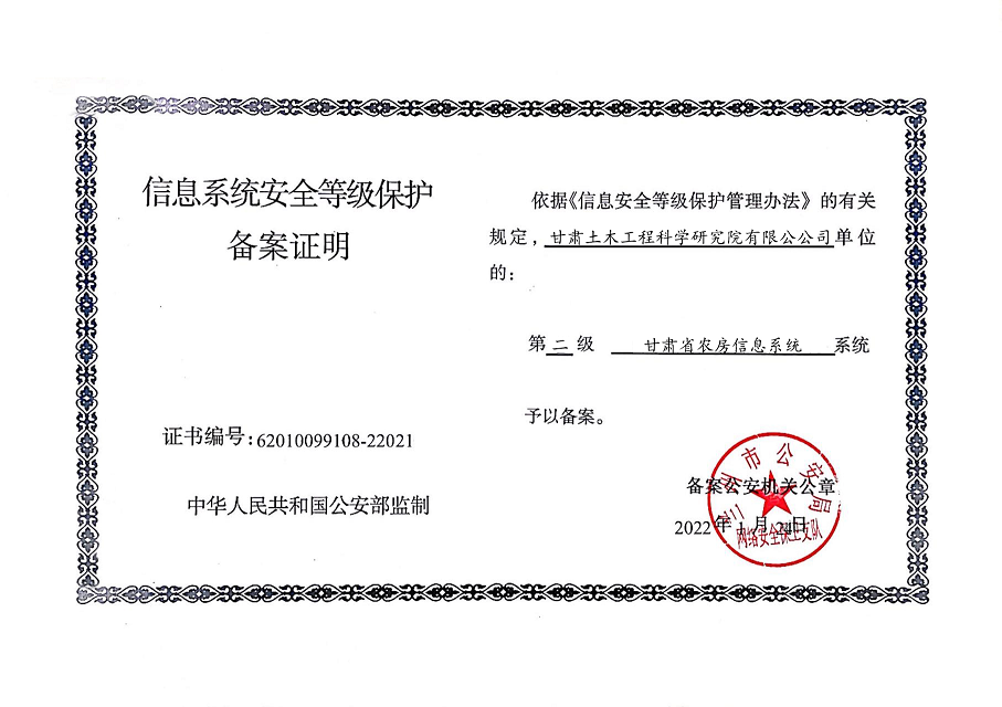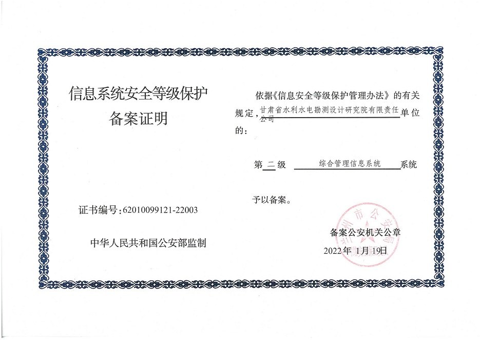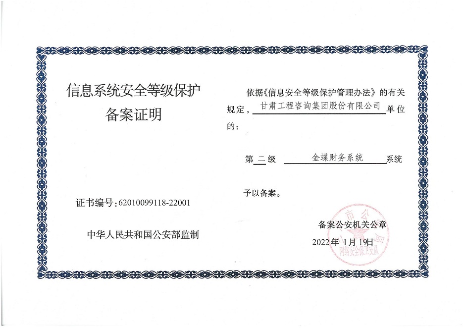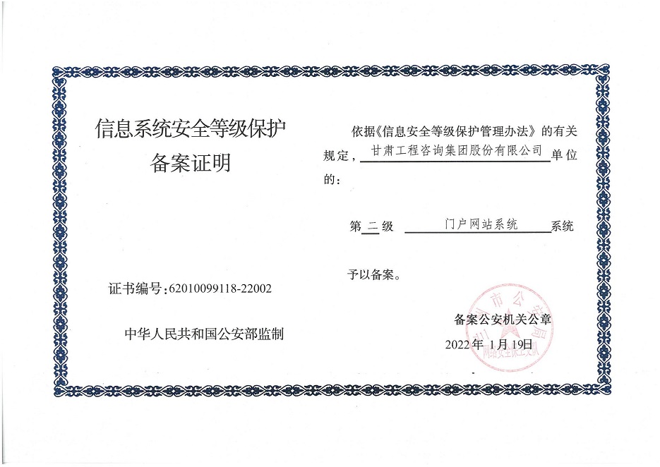 甘肅工程咨詢集團股份公司信息系統(tǒng)通過安全等級保護2.0備案認證