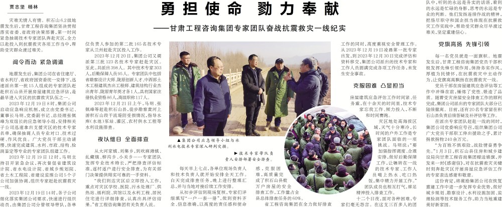 1月15日,《甘肅日?qǐng)?bào)》第4版刊載《勇?lián)姑?勠力奉獻(xiàn)——甘肅工程咨詢(xún)集團(tuán)專(zhuān)家團(tuán)隊(duì)奮戰(zhàn)抗震救災(zāi)一線(xiàn)紀(jì)實(shí)》。該報(bào)道全面反映了集團(tuán)公司黨委心系災(zāi)區(qū)、聞令而動(dòng)的一系列擔(dān)當(dāng)作為務(wù)實(shí)舉措,深度展現(xiàn)了專(zhuān)家團(tuán)隊(duì)和干部職工向險(xiǎn)而行、甘于奉獻(xiàn)的抗震救災(zāi)生動(dòng)實(shí)踐,進(jìn)一步凝聚起奮力奪取抗震救災(zāi)全面勝利的強(qiáng)大力量。