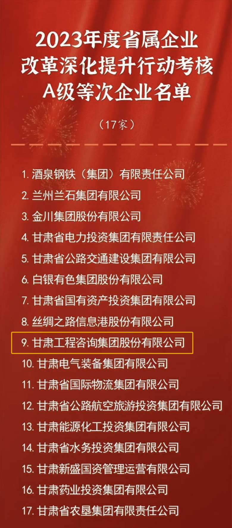 根據(jù)《2023年全省國(guó)企改革深化提升行動(dòng)考核評(píng)估工作方案》,2023年度省屬企業(yè)改革深化提升行動(dòng)考核結(jié)果已經(jīng)省政府國(guó)資委主任辦公會(huì)審議通過(guò)。A級(jí)等次企業(yè)名單如下: