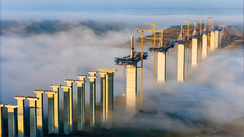 晨光初現(xiàn),建設(shè)中的橋梁在薄霧中若隱若現(xiàn),跨越河流、連接兩岸,為隴東大地經(jīng)濟(jì)騰飛插上翅膀。