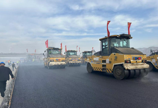 田間的風(fēng)醇厚柔潤,壓路機(jī)上隨風(fēng)飄搖的旗幟迸發(fā)出一陣陣吶喊聲,為道路瀝青中面層鋪筑加油助威。