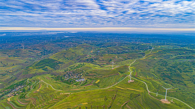 梯田蜿蜒起伏,村莊錯(cuò)落有致,云海連綿不絕,風(fēng)車悠然旋轉(zhuǎn),織就了人與自然和諧共生的美麗畫卷。