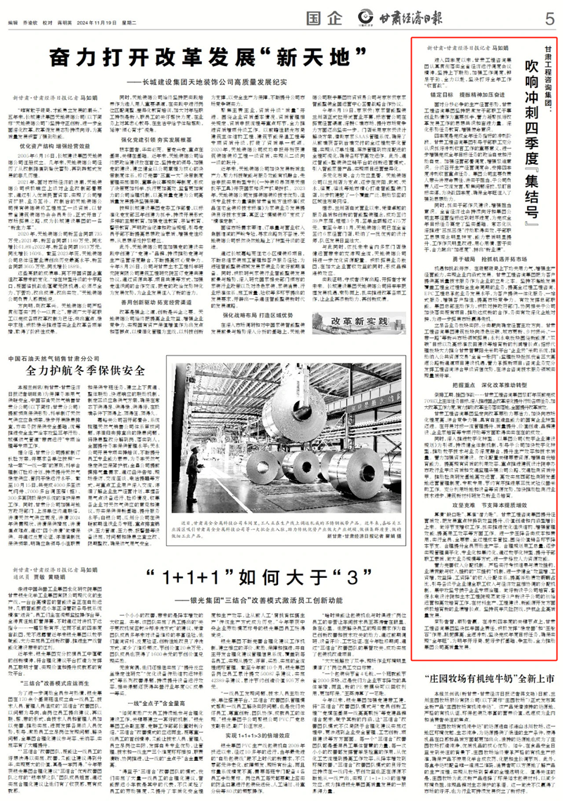 倒排工期、掛圖作戰(zhàn)……甘肅工程咨詢集團緊盯年底前完成70%以上主體任務(wù)目標(biāo),深入推進(jìn)國企改革深化提升行動各項任務(wù),加大改革工作力度,有力推動改革任務(wù)落實落地,全面提升改革質(zhì)效。