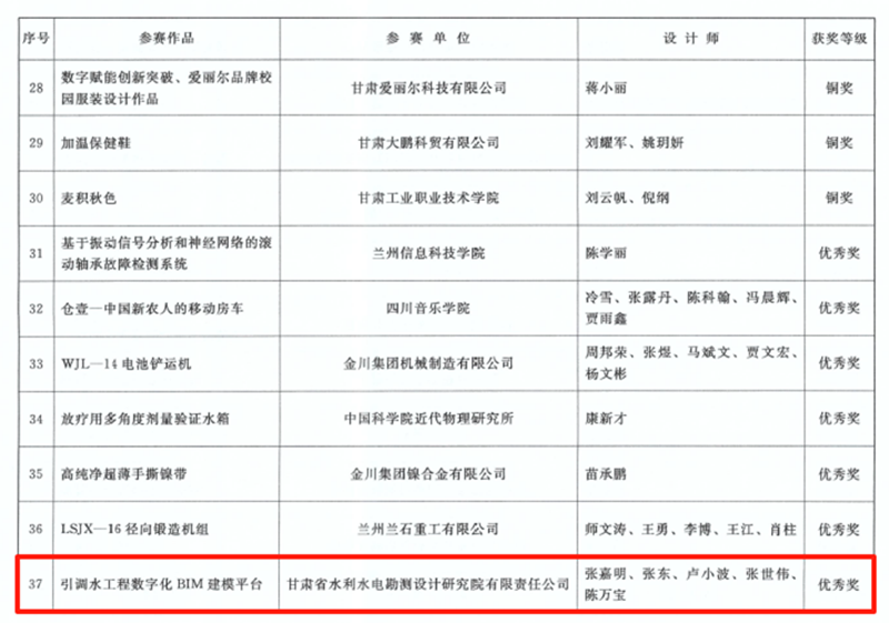 在甘肅省第七屆BIM技術(shù)應(yīng)用大賽中,建筑設(shè)計(jì)院、水電設(shè)計(jì)院報(bào)送的項(xiàng)目共斬獲12項(xiàng)獎勵,包攬了設(shè)計(jì)組16個(gè)獎項(xiàng)中的10項(xiàng)。在甘肅省第五屆“創(chuàng)新杯”工業(yè)設(shè)計(jì)大賽中,水電設(shè)計(jì)院《引調(diào)水工程數(shù)字化BIM建模平臺》項(xiàng)目獲優(yōu)秀獎。在第十七屆全省職工優(yōu)秀技術(shù)創(chuàng)新成果獎中,水電設(shè)計(jì)院、土木工程院申報(bào)的兩個(gè)項(xiàng)目分獲創(chuàng)新成果獎三等獎,其中,《棄渣場三維設(shè)計(jì)平臺》項(xiàng)目是全省水利系統(tǒng)唯一獲獎成果。