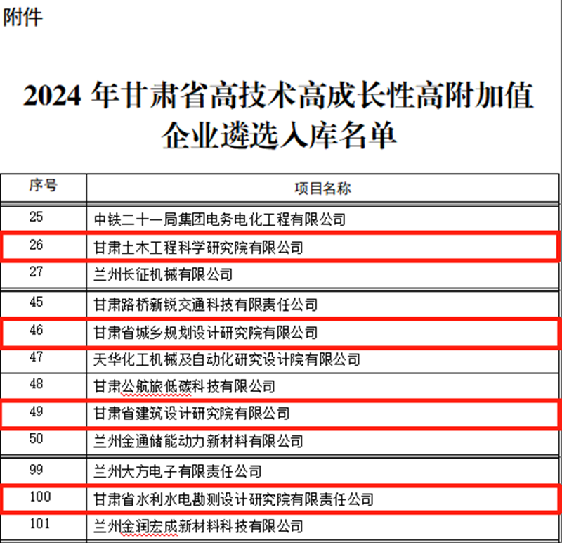 近日,甘肅省科技廳公布2024年甘肅省高技術(shù)高成長性高附加值(簡(jiǎn)稱“三高”)企業(yè)名單,甘肅工程咨詢集團(tuán)旗下省建筑設(shè)計(jì)院、省水電設(shè)計(jì)院、省城鄉(xiāng)規(guī)劃院、甘肅土木工程院從眾多企業(yè)中脫穎而出,成功登上全省首批“三高”企業(yè)榜單。