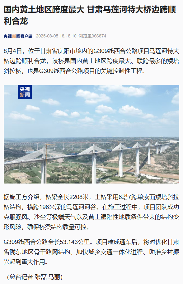 近日,由甘肅工程咨詢(xún)集團(tuán)旗下省交通監(jiān)理公司承監(jiān)的G309線(xiàn)西合公路項(xiàng)目建設(shè)取得重大進(jìn)展——馬蓮河特大橋邊跨順利合龍。項(xiàng)目建成后,將進(jìn)一步完善區(qū)域路網(wǎng)結(jié)構(gòu),對(duì)促進(jìn)慶陽(yáng)地區(qū)經(jīng)濟(jì)社會(huì)發(fā)展具有重要意義。
