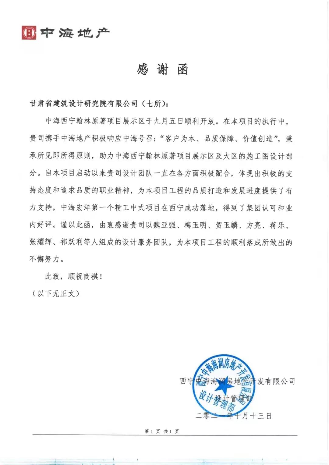 日前,建筑設(shè)計(jì)院收到來自西寧中海地產(chǎn)的一封感謝信,贊揚(yáng)設(shè)計(jì)七所魏亞強(qiáng)、梅玉明、賀玉麟、方亮、蔣樂、張耀輝、祁躍利組成的設(shè)計(jì)團(tuán)隊(duì)在中海西寧翰林原著項(xiàng)目展示區(qū)及大區(qū)施工設(shè)計(jì)中的突出表現(xiàn)。