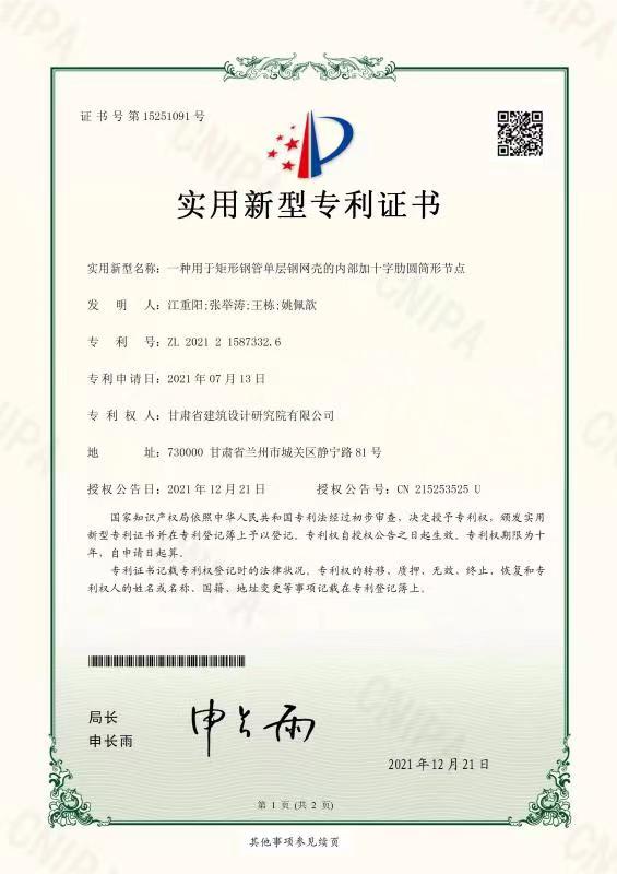 近日,從國家知識產(chǎn)權(quán)局傳來好消息,由建筑設(shè)計院總工程師張舉濤、設(shè)計四所總工程師江重陽、設(shè)計五院總工程師王棟、設(shè)計四所工程師姚佩歆聯(lián)合申報的“一種用于矩形鋼管單層鋼網(wǎng)殼的內(nèi)部加十字肋圓筒形節(jié)點(diǎn)”技術(shù),喜獲國家實(shí)用新型專利。