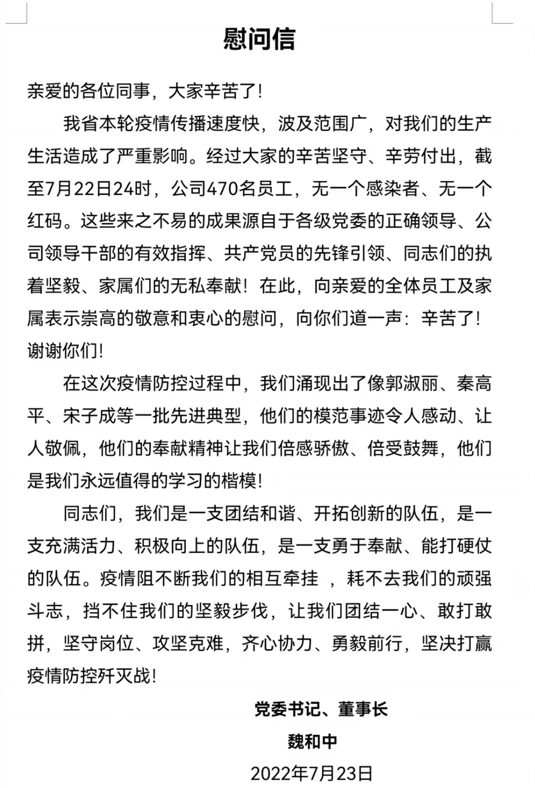 近日,甘肅省建設(shè)監(jiān)理有限責(zé)任公司黨委書(shū)記、董事長(zhǎng)魏和中向全體職工發(fā)出慰問(wèn)信,對(duì)在疫情期間值守項(xiàng)目一線(xiàn)和抗戰(zhàn)疫情一線(xiàn)的黨員干部職工致以最誠(chéng)摯的關(guān)心和感謝。同時(shí),號(hào)召全體干部職工向疫情防控期間涌現(xiàn)出的一線(xiàn)先進(jìn)典型個(gè)人和共產(chǎn)黨員先鋒者學(xué)習(xí),團(tuán)結(jié)一心、敢打敢拼,堅(jiān)守崗位、攻堅(jiān)克難,齊心協(xié)力、勇毅前行,堅(jiān)決打贏疫情防控殲滅戰(zhàn)。