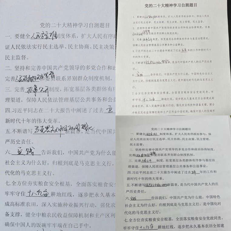 開展答卷測(cè)試,檢驗(yàn)學(xué)習(xí)成效。招標(biāo)咨詢集團(tuán)第三黨支部所屬咨詢中心采取線上視頻會(huì)議的方式組織全體黨員居家學(xué)習(xí)黨的二十大報(bào)告原文,通過(guò)學(xué)原文、悟原理、反復(fù)學(xué)、時(shí)常悟,深刻領(lǐng)會(huì)和準(zhǔn)確把握?qǐng)?bào)告的精神實(shí)質(zhì)、豐富內(nèi)涵和核心要義。同時(shí),對(duì)黨的二十大報(bào)告相關(guān)知識(shí)開展應(yīng)知應(yīng)會(huì)測(cè)試,通過(guò)答卷的方式檢驗(yàn)黨員干部對(duì)黨的二十大精神的理解和把握,達(dá)到以考促學(xué)、以學(xué)促用、學(xué)用結(jié)合、知行合一的目的。
