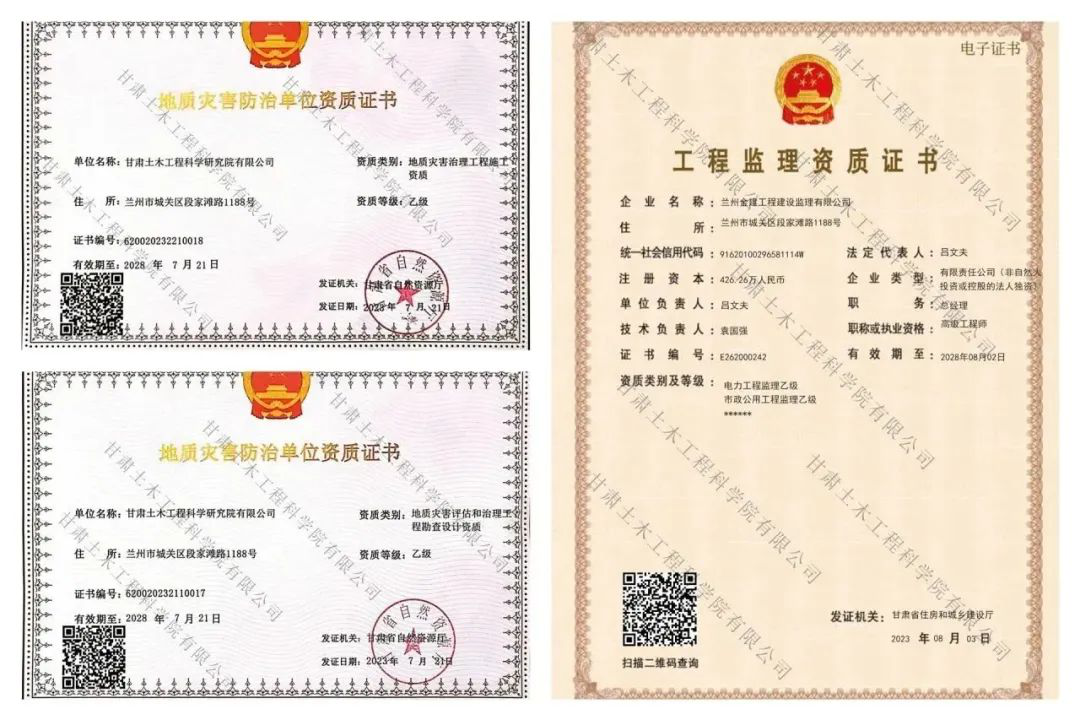 近期,土木工程院申報的地質(zhì)災(zāi)害評估和治理工程勘查設(shè)計乙級、地質(zhì)災(zāi)害治理工程施工乙級兩項資質(zhì)獲省自然資源廳批準。土木工程院全資子公司蘭州金建工程建設(shè)監(jiān)理有限公司申報的電力工程監(jiān)理乙級資質(zhì)也順利通過省住房和城鄉(xiāng)建設(shè)廳審批。