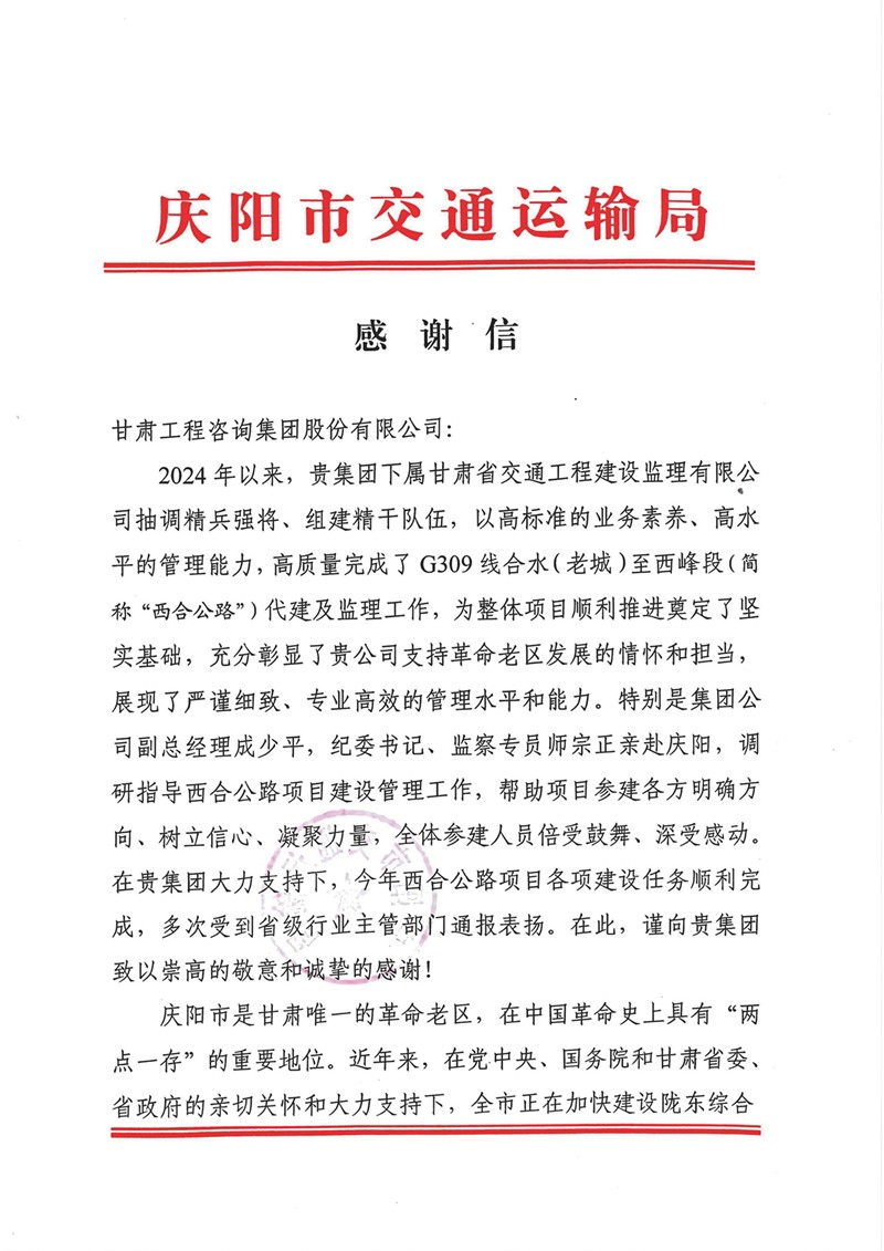 慶陽市交通運(yùn)輸局向甘肅工程咨詢集團(tuán)發(fā)來感謝信