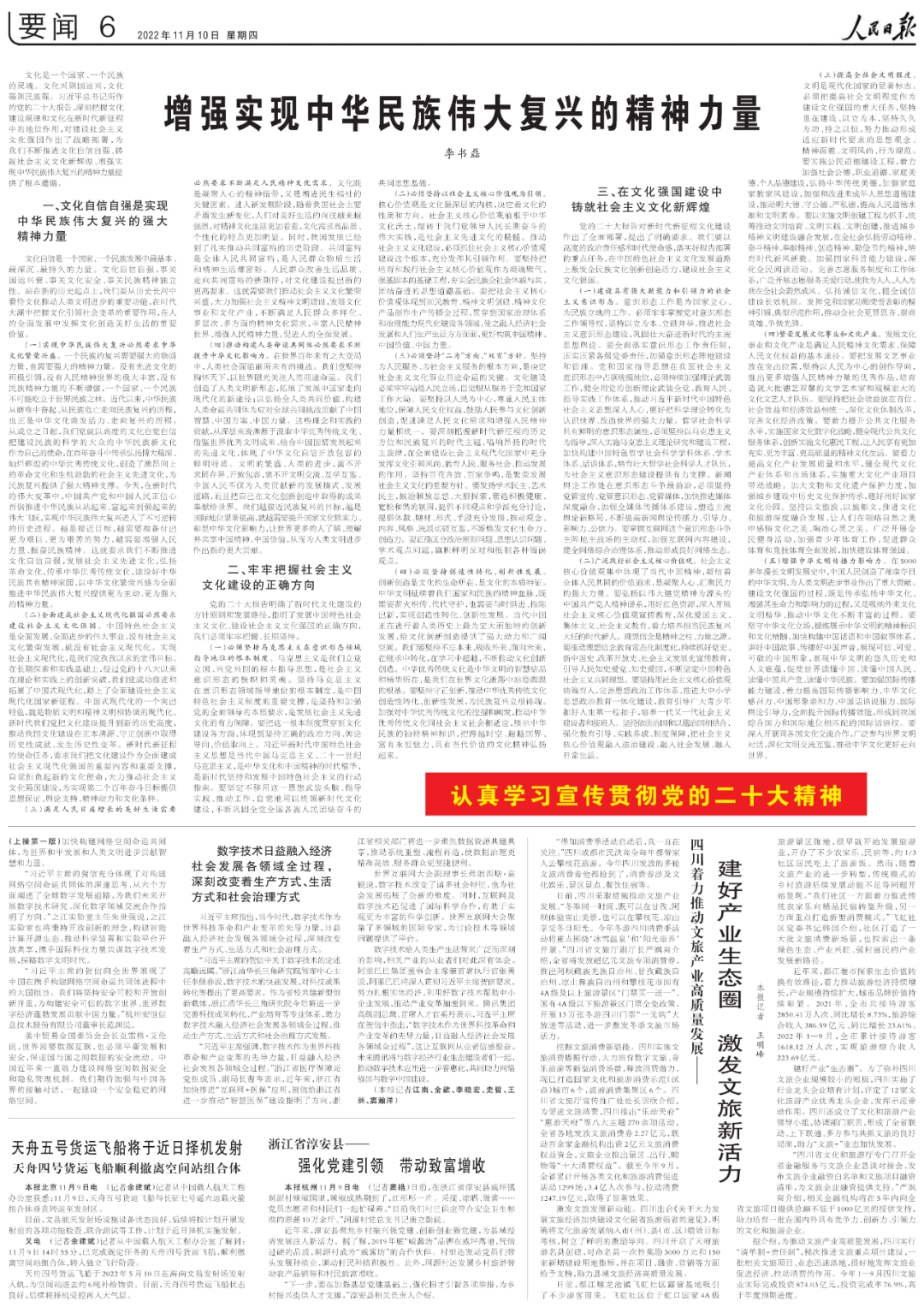 文化是一個國家、一個民族的靈魂。文化興則國運興,文化強則民族強。習近平總書記所作的黨的二十大報告,深刻把握文化建設規(guī)律和文化在新時代新征程中的地位作用,對建設社會主義文化強國作出了戰(zhàn)略部署,為我們不斷推進文化自信自強、鑄就社會主義文化新輝煌、增強實現(xiàn)中華民族偉大復興的精神力量提供了根本遵循。